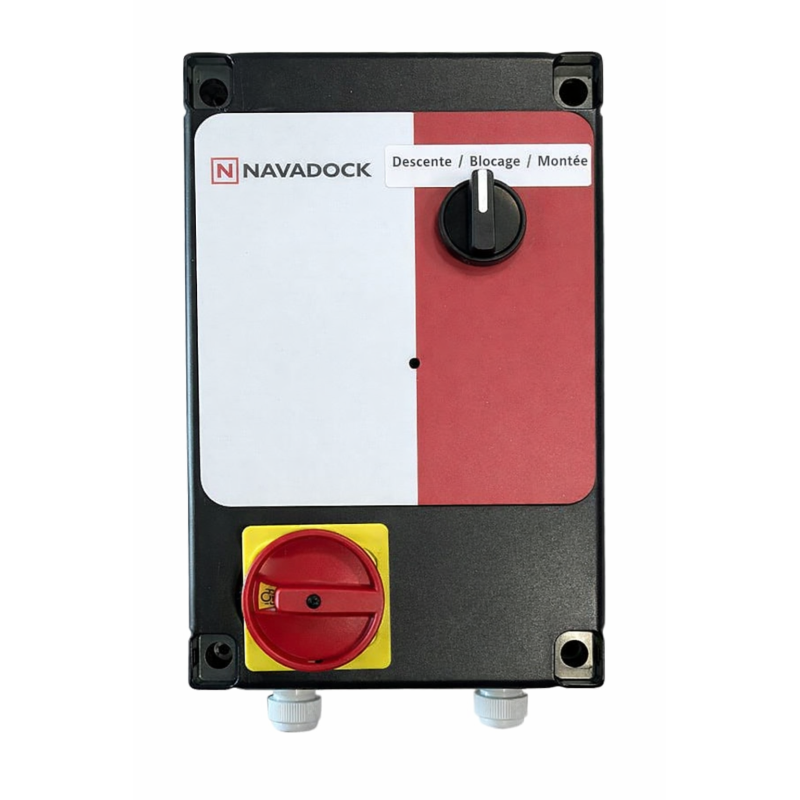 Pour niveleur à lèvre télescopique - Sectionneur - Alimentation en 400 V triphasé -Tension de commande carte en 24 V DC à 2 électrovannes pour les niveleurs (ASSA ABLOY CRAWFORD – PROMSTAHL – NOVOFERM ) Inclus commutateur pour lampe de quai en 220V et commutateur pour SAS gonflable. Fonctionne avec le groupe hydraulique A-00176